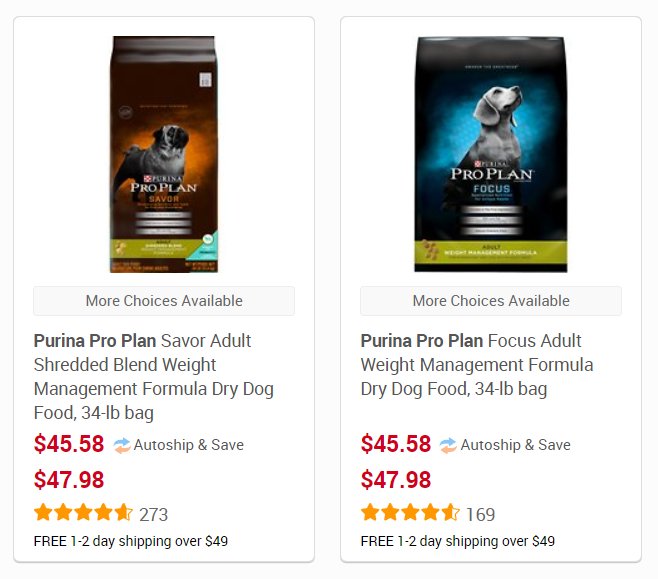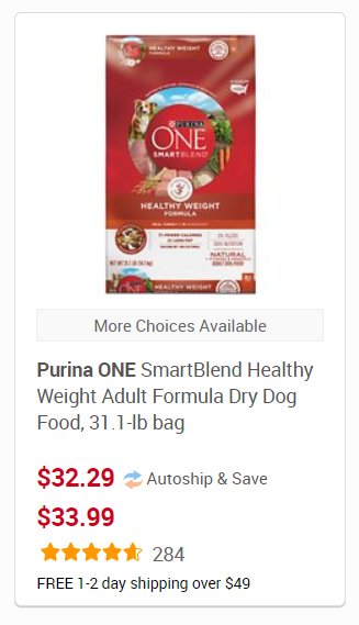 I looked at Pedigree, Purina (two kinds) and Costco’s Healthy Weight offering.