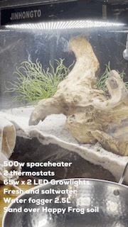 c. Fresh Water and Saltwater: Keep a dish of fresh dechlorinated water and another dish of saltwater (made with marine salt mix) in the tank. Both should be shallow enough for the crabs to access without difficulty.